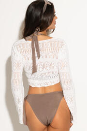This lightweight crochet knit cardigan is the ultimate versatile layer — perfect for throwing on over your bikini. With its flattering V-neck, long sleeves, and short length, it gives you just the right amount of coverage while keeping things effortlessly chic. The tie front can be styled multiple ways, so you can wear it open, wrapped, or knotted to suit your mood. Breezy, beautiful, and endlessly versatile — this is your go-to cover-up for sun, sea, and seriously stylish summer days.